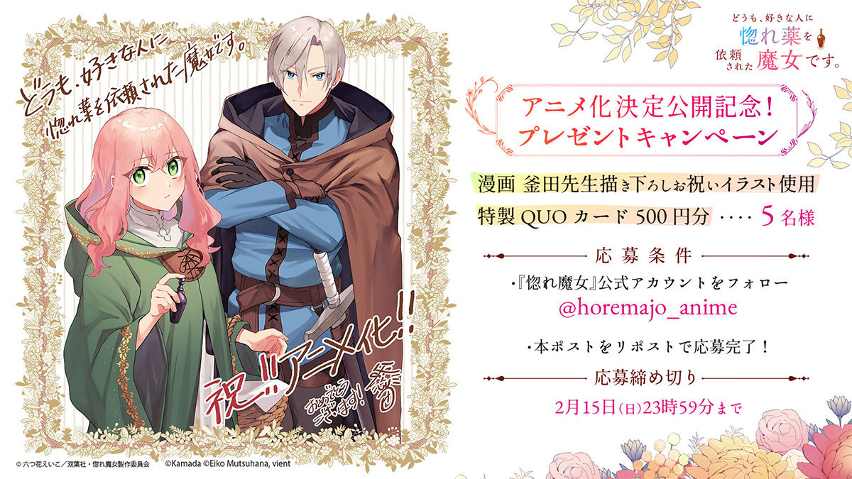 「どうも、好きな人に惚れ薬を依頼された魔女です。」TVアニメ化決定を記念し、TVアニメ「どうも、好きな人に惚れ薬を依頼された魔女です。」公式Xをフォロー・対象の投稿をリポストして頂いた方の中から抽選で5名様に、漫画・釜田先生描き下ろしお祝いイラスト使用した特製QUOカード500円分をプレゼント!