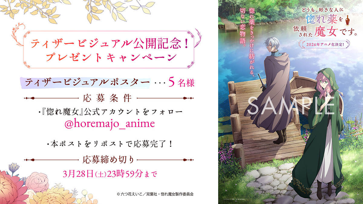 ティザービジュアルの公開を記念し、TVアニメ「どうも、好きな人に惚れ薬を依頼された魔女です。」公式Xをフォロー・対象の投稿をリポストして頂いた方の中から抽選で5名様に、ティザービジュアルを使用したポスターをプレゼント!